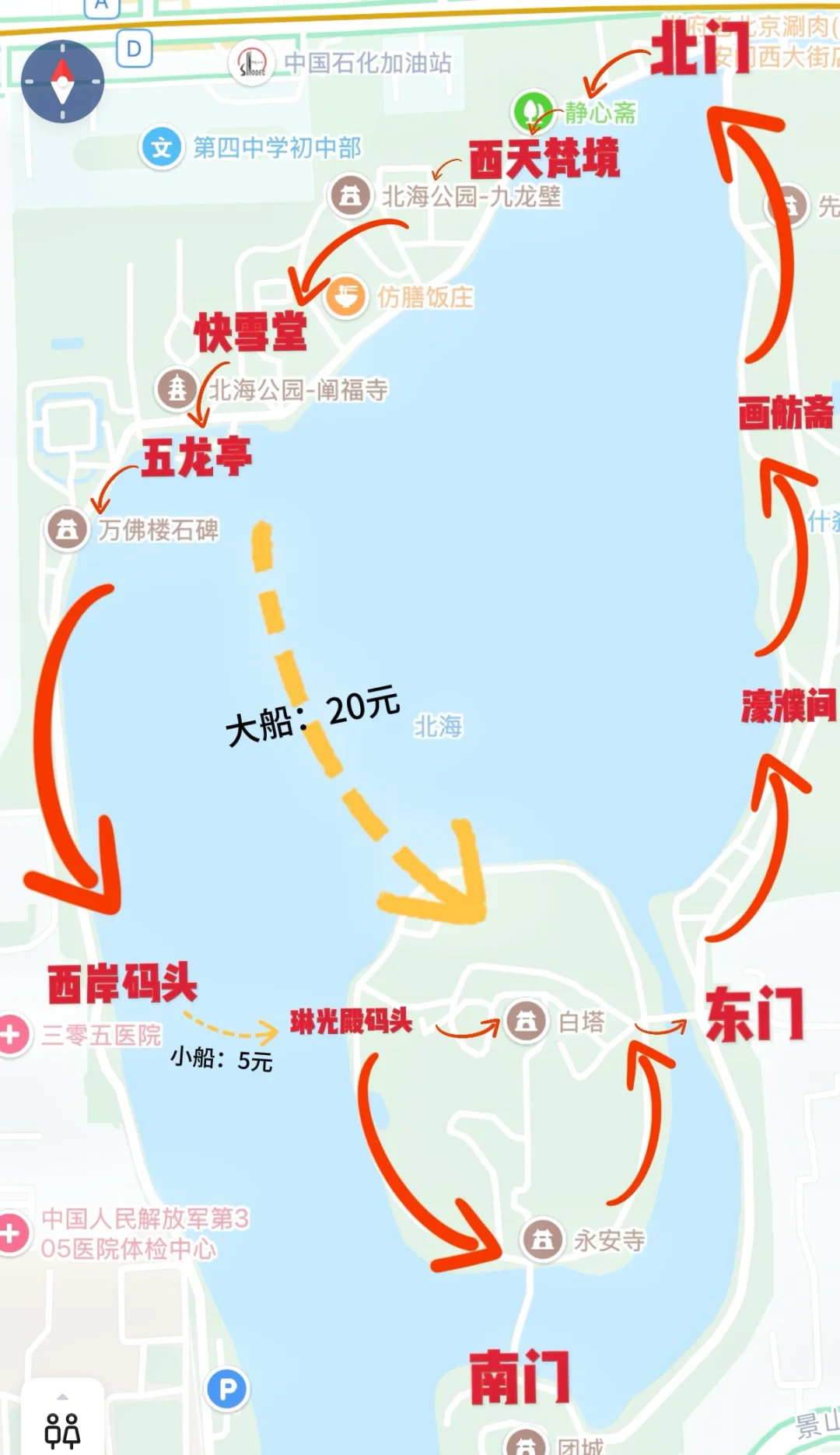 North Gate → Jingxin Zhai → Western Heavenly Realm → Nine Dragon Wall → Kuai Xue Hall → Wulong Pavilion → Wanfo Tower Ruins & Stone Tablet → West Bank Dock for the ferry (5 yuan) to Lingguang Pavilion Dock → White Pagoda and Yong'an Temple → East Gate (without exiting the park) → Haopu Area → Huafan Zhai → North Gate Exit