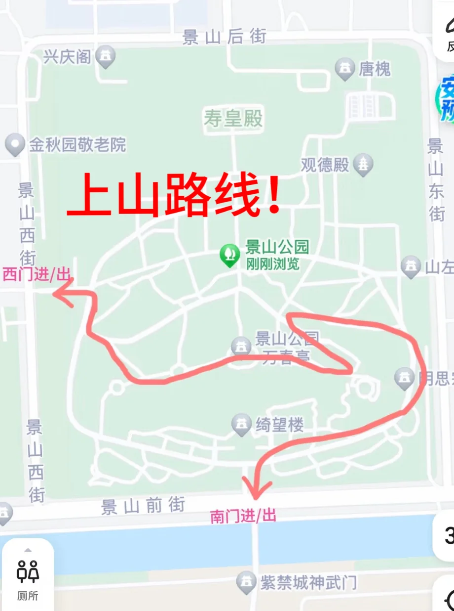 Jingshan Park isn’t very large. If you’re just aiming for the top, it’ll only take about 10 minutes, even at my pace. But if you have time to explore slowly, spending half an hour to an hour is just right. Here are two recommended routes for you: