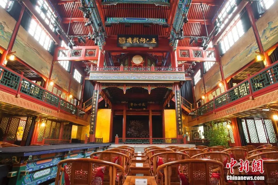 As I pushed the door open, I entered a narrow hallway with dim yellow lights, and the cobblestones beneath my feet felt a bit rough but had a pleasantly cool dampness. Continuing inside, the entire theater unfolded like an old Beijing suddenly revealed: three sides of corridor, delicate wooden railings, black lacquered pillars, and a ceiling adorned with faded cloud patterns. I instantly forgot about buying shoes and thought, “This place is definitely gonna look great in photos.”