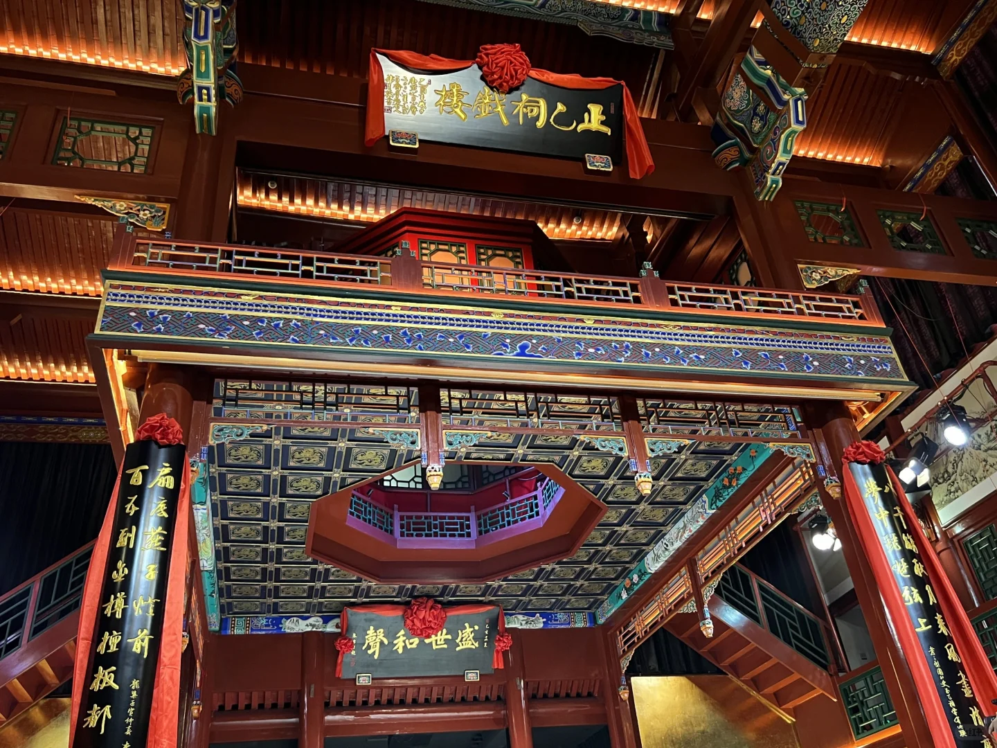 That afternoon, I initially just wanted to go to Wangfujing to buy a pair of shoes, but the navigation led me down a quiet little alley. From a distance, I could hear the “dong dong qiang” sounds of gongs and drums, like someone was striking a heartbeat in the air. I followed the sound, and when I looked up, I saw the “Zhengyi Ci Theater” sign, an old wooden plaque with black background and golden letters, quietly hanging on the gray brick wall. The entrance only had a narrow opening, almost like it was intentionally hidden away.