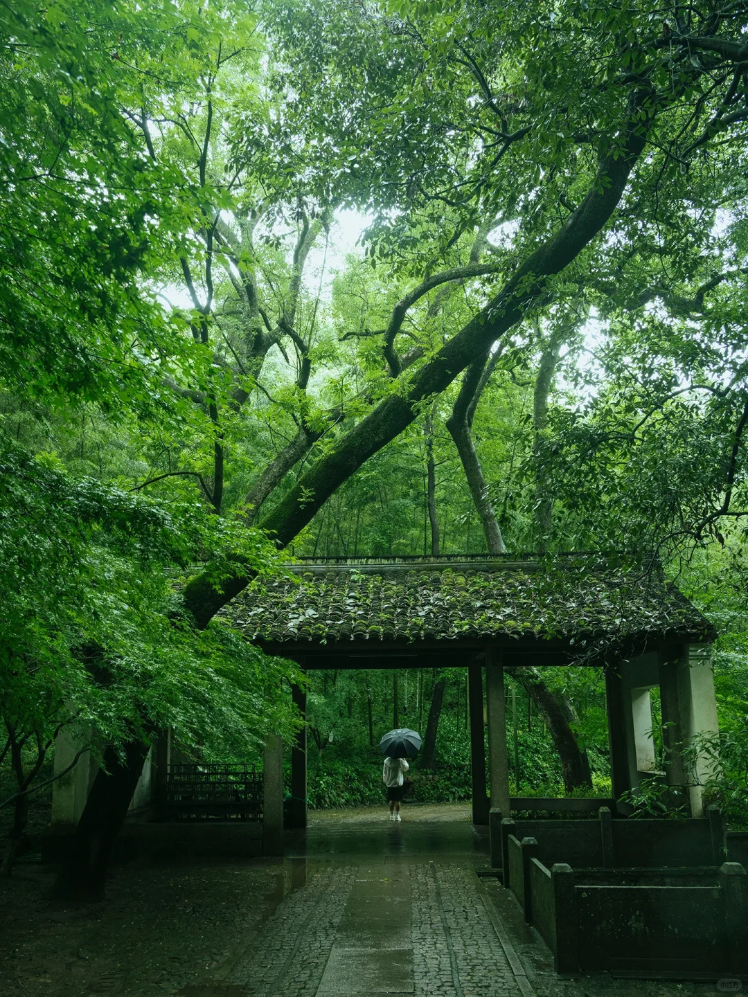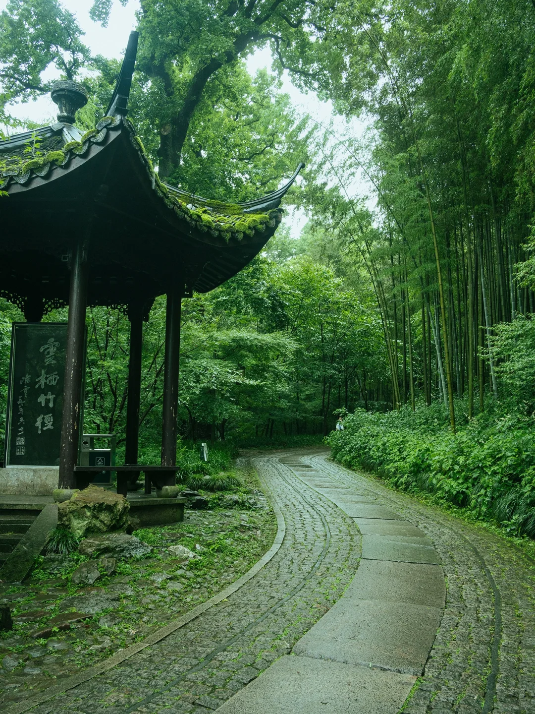 Around 10 AM that day, West Lake was probably packed with people lining up to take pictures of the “Broken Bridge,” while at the entrance of Yunqi Bamboo Path, even the ticket lady was yawning. The moment I scanned my ticket and stepped in, all I could hear was the sound of rain pattering on the bamboo leaves, my footsteps even had their own background music. On either side of the path were trees over a hundred years old, their rough bark draped with wet moss, like they were wearing a yellow-green sweater that felt cool to the touch. The air mingled with the scent of bamboo leaves, wet earth, and a hint of Longjing tea—the tea fields were right next to the deep bamboo forest.