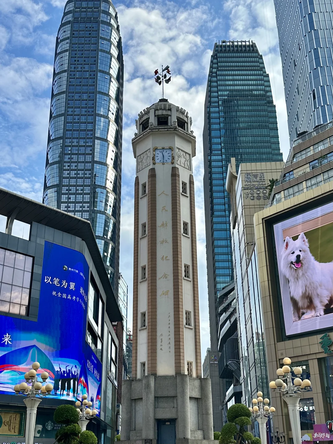 Even though now Jiefangbei is surrounded by shopping malls and lights, it used to be a silent witness to history. They say it used to be called "War of Resistance Monument" before it was changed to "People's Liberation Monument." Isn't that super historical? And this monument quietly stands at the center of the pedestrian street, watching over Chongqing's past, present, and future. It's a great spot for photos, especially in the morning when there are fewer people, and the sunlight shines down, illuminating the monument and the street beautifully.