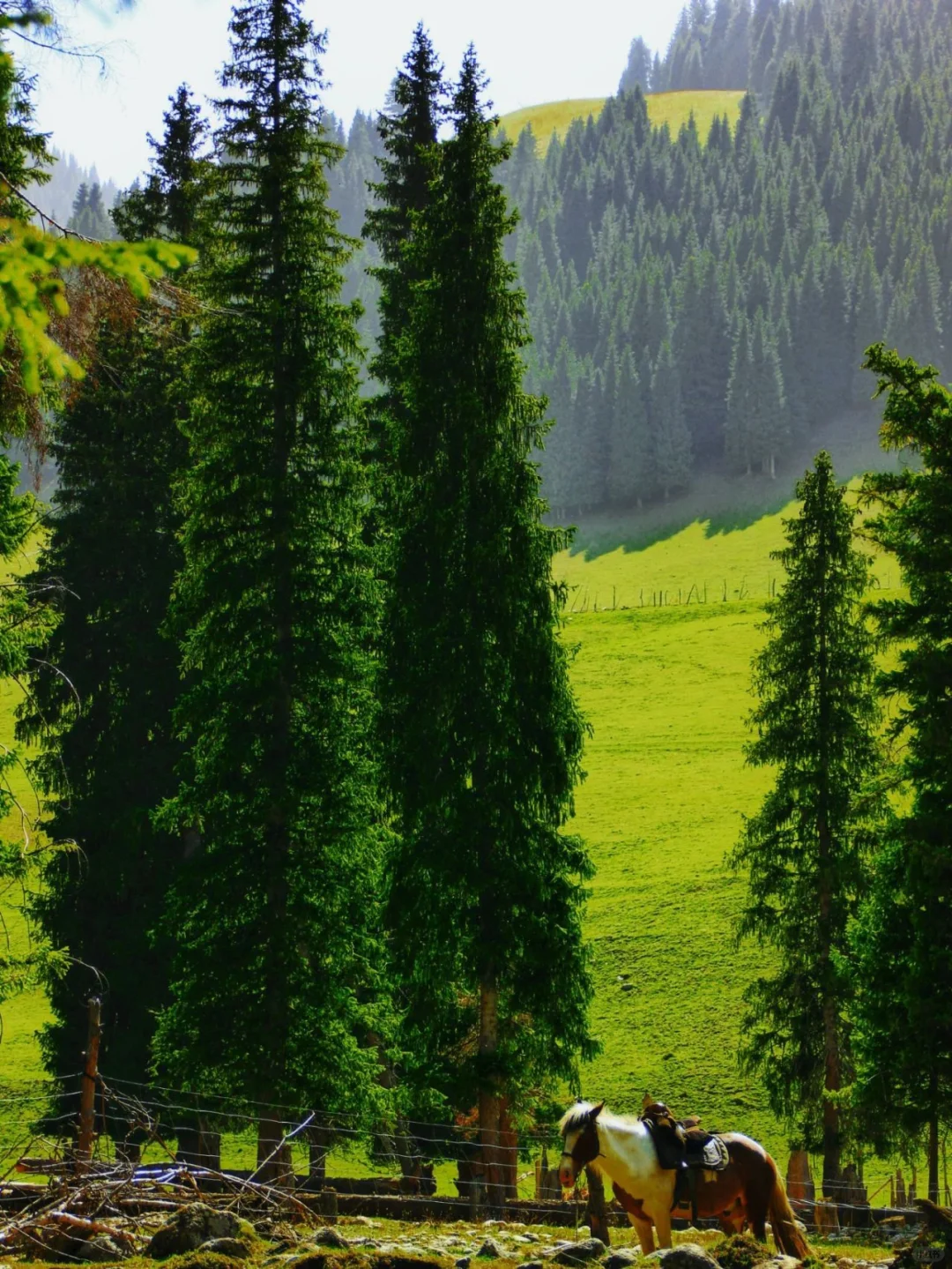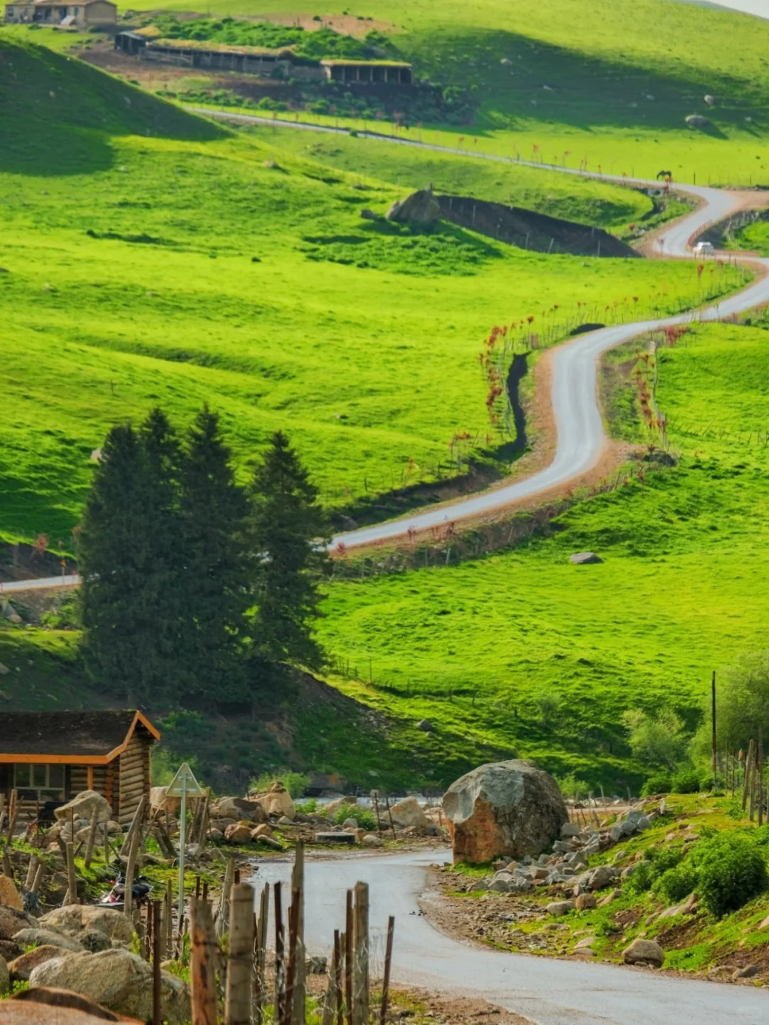 It’s not Switzerland or New Zealand, but Xinjiang’s Yili in summer. Blue sky + white clouds + snow-capped mountains + wooden cabins + grasslands—the picture that others spend a fortune flying abroad to see is all packaged and presented to you here in one go. Plus, it’s not a stiff tourist spot; it’s a genuine village where real people live. The wooden walls have darkened in the sun, dried milk curds hang from the door frames, and an old lady sits at the door weaving a whip…every shot you take feels cinematic.