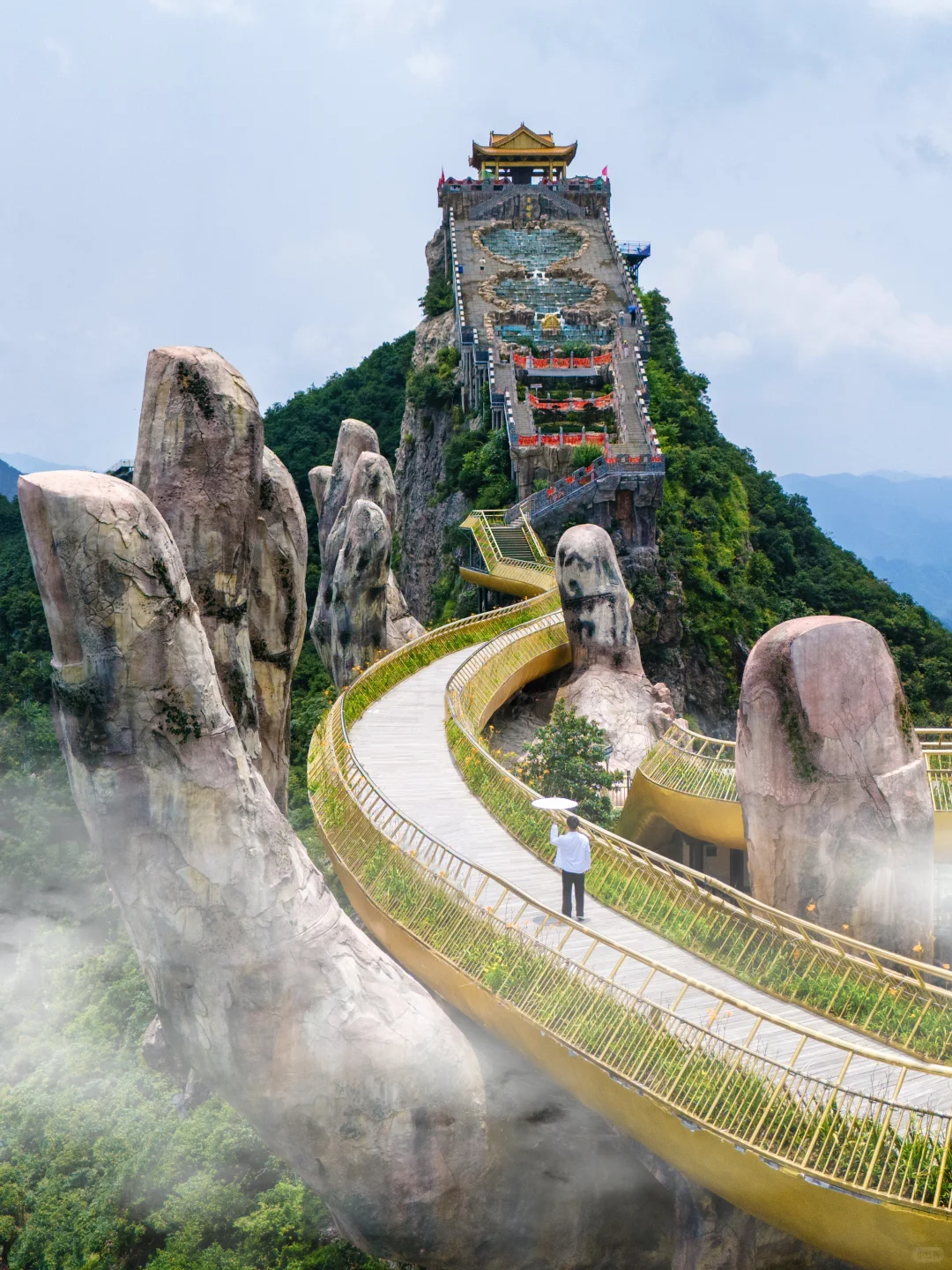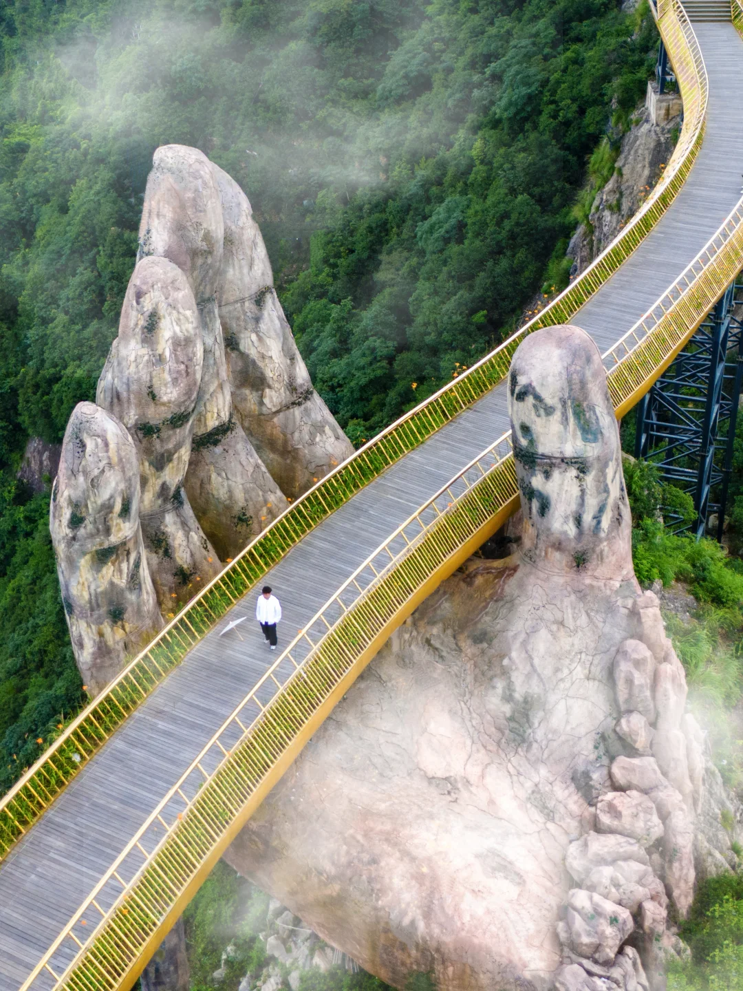 De brug zelf is niet lang, 30 meter, maar aan beide uiteinden zijn er twee gouden handen van 15 meter hoog, de vingers heel duidelijk, het lijkt alsof iemand de bergen opheft.